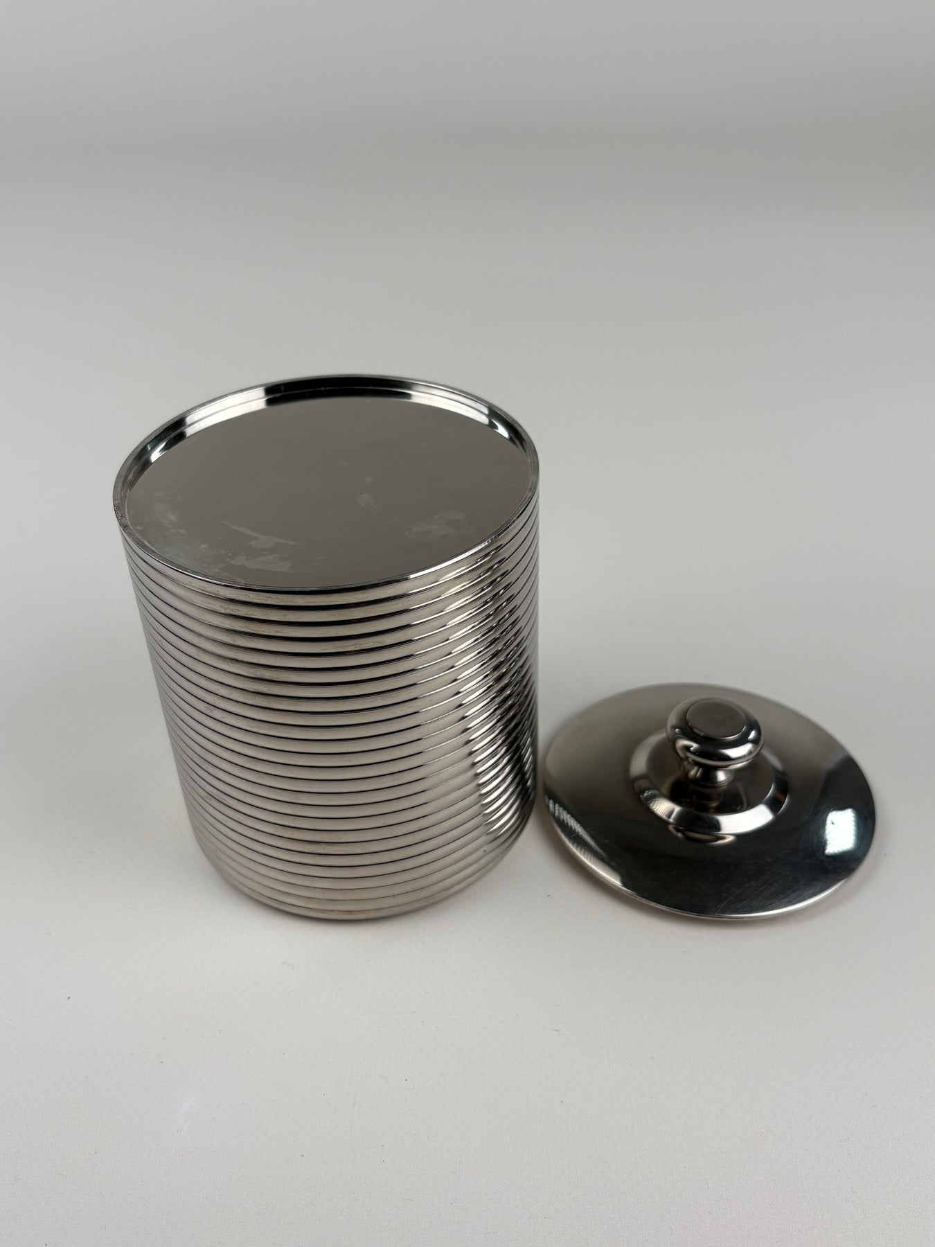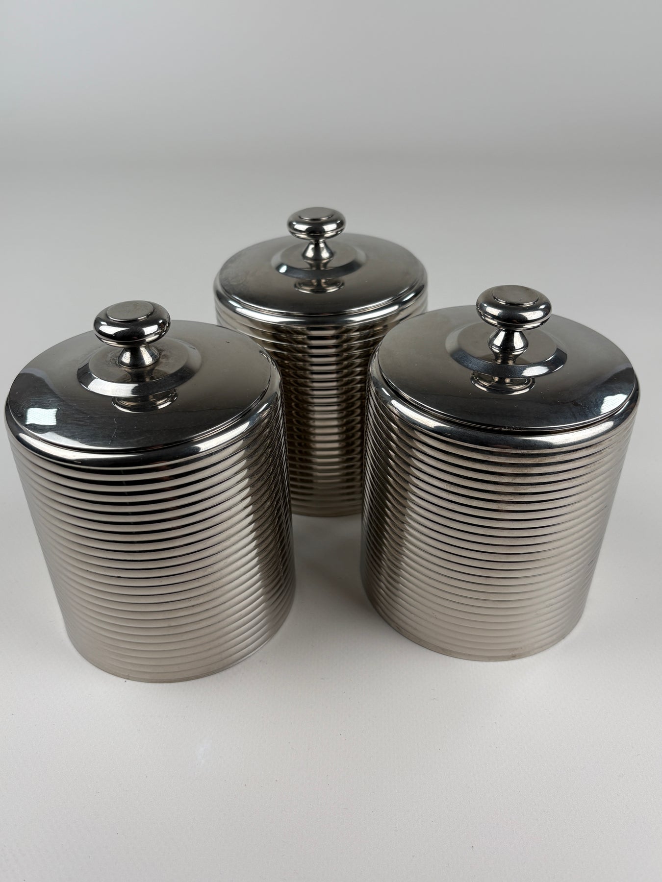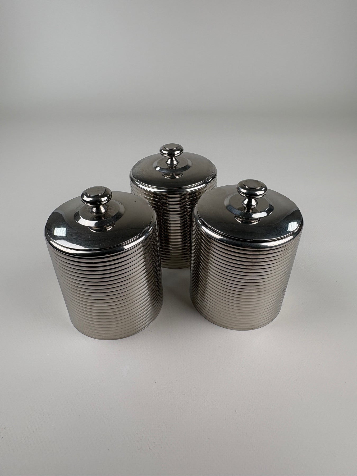 Dieses stilvolle 3er Set Vintage Gewürzdosen aus Edelstahl überzeugt durch sein klares, zeitloses Design und die feine horizontale Rillenstruktur. Die schlichten Deckel mit Knaufgriff unterstreichen den minimalistischen Look und sorgen gleichzeitig für praktische Handhabung. Ideal zur Aufbewahrung von Gewürzen, Zucker oder kleinen Küchenutensilien – funktional und dekorativ zugleich im Mid-Century Stil.