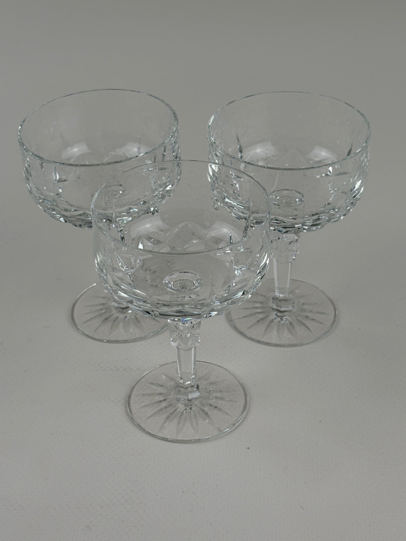 Dieses elegante Set aus drei Vintage Cognacgläsern überzeugt durch seine klassische Form und die feinen Schliffdetails im Glas. Der stabile Fuß und der facettierte Stiel verleihen den Gläsern eine hochwertige Ausstrahlung und sorgen für einen sicheren Stand.