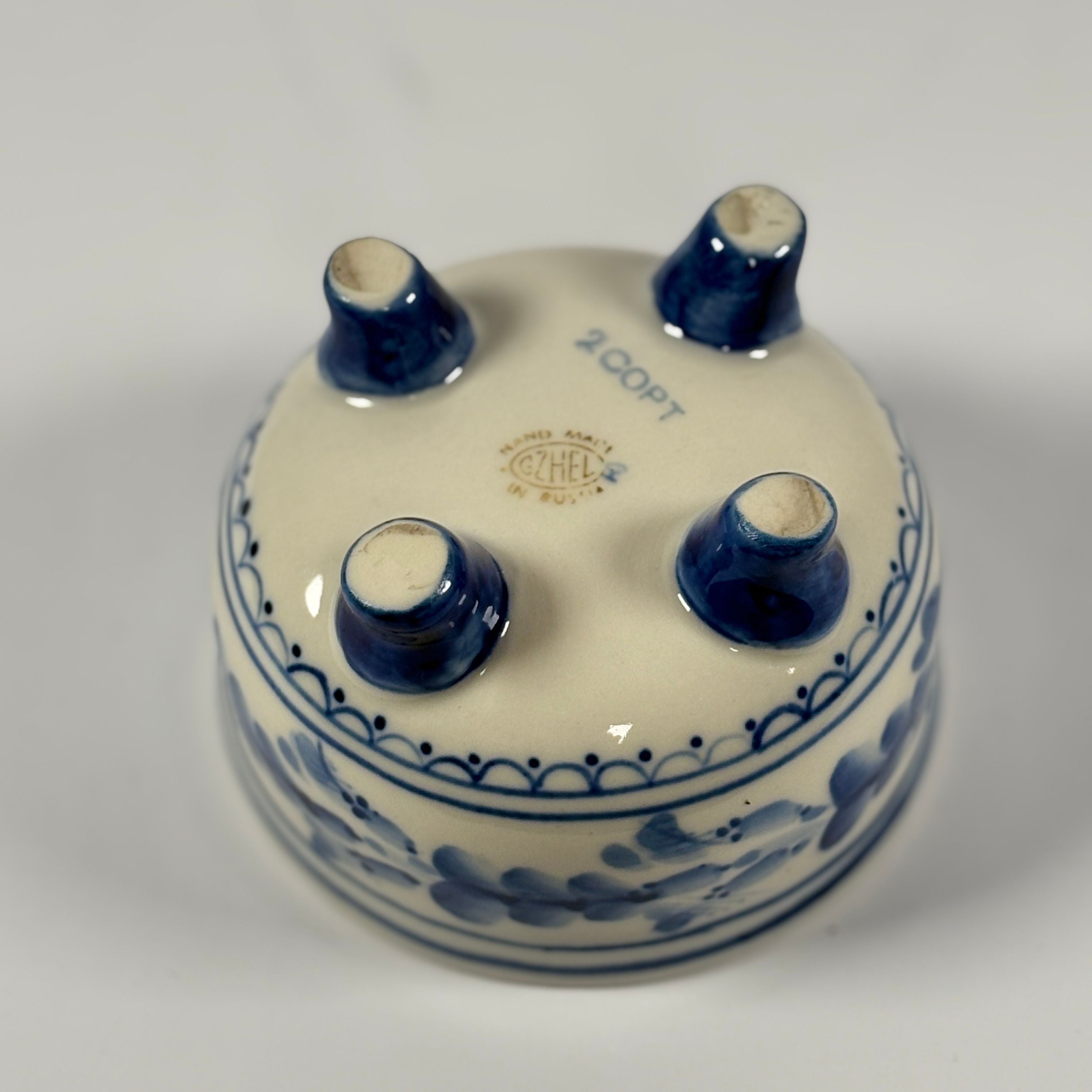 Die Dose steht auf vier kleinen Füßen, was ihr eine besondere Eleganz und Leichtigkeit verleiht. Auf der Unterseite befindet sich die originale Gzhel-Manufakturmarke („Hand Made in Russia“) sowie die Modellnummer 2007, was die Authentizität und Herkunft des Stücks bestätigt.