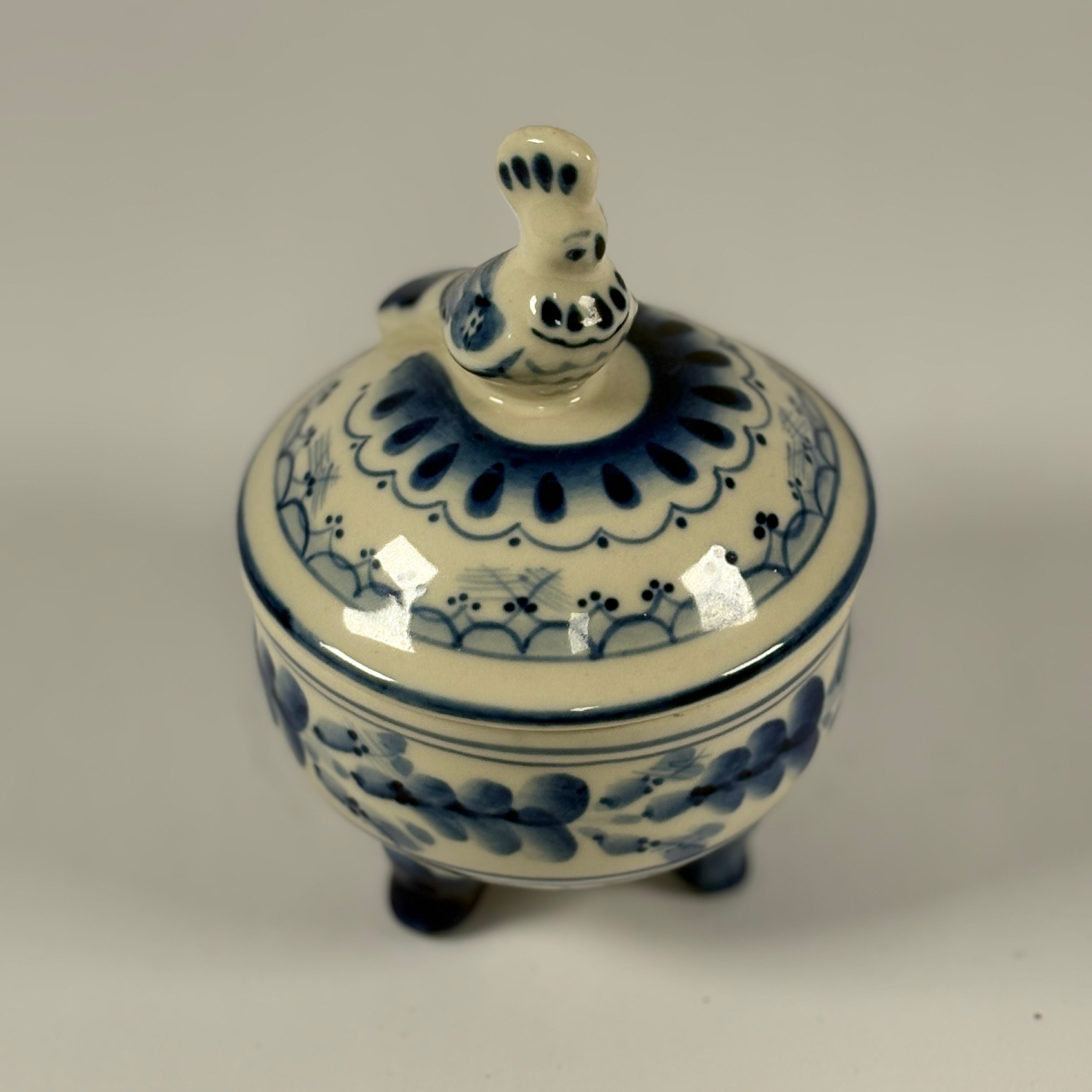 Vintage Keramikdose auf Füßen – Gzhel, handbemalt