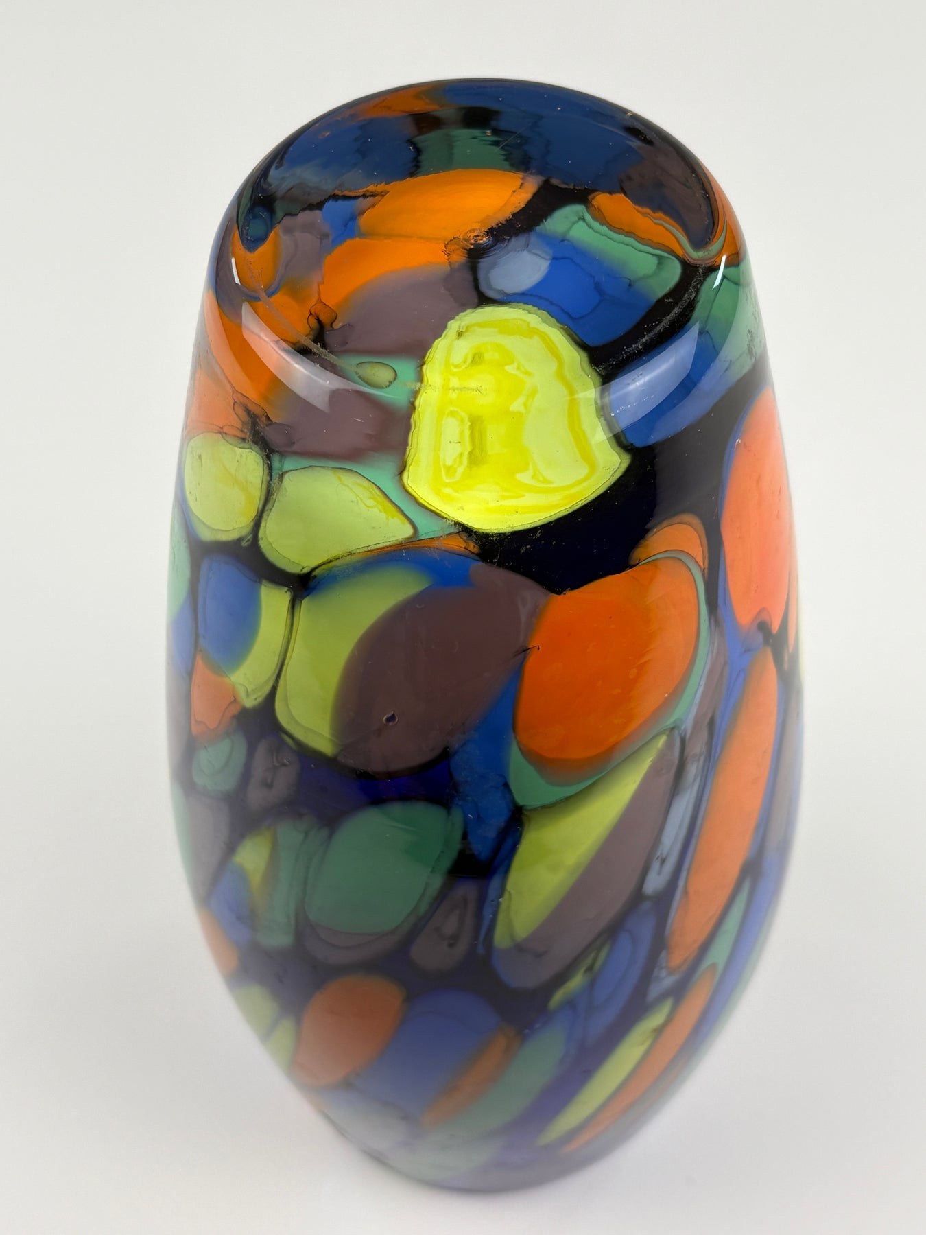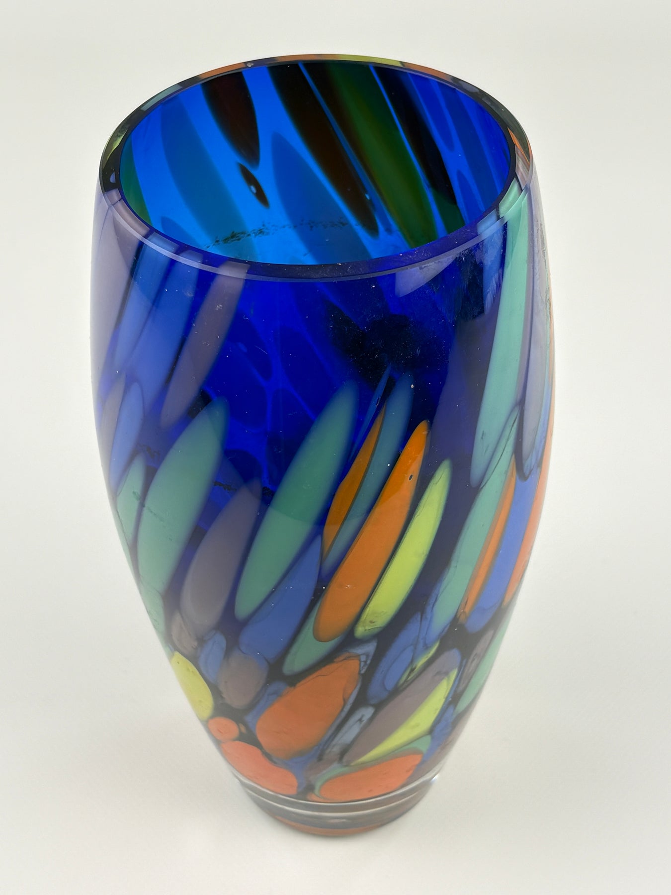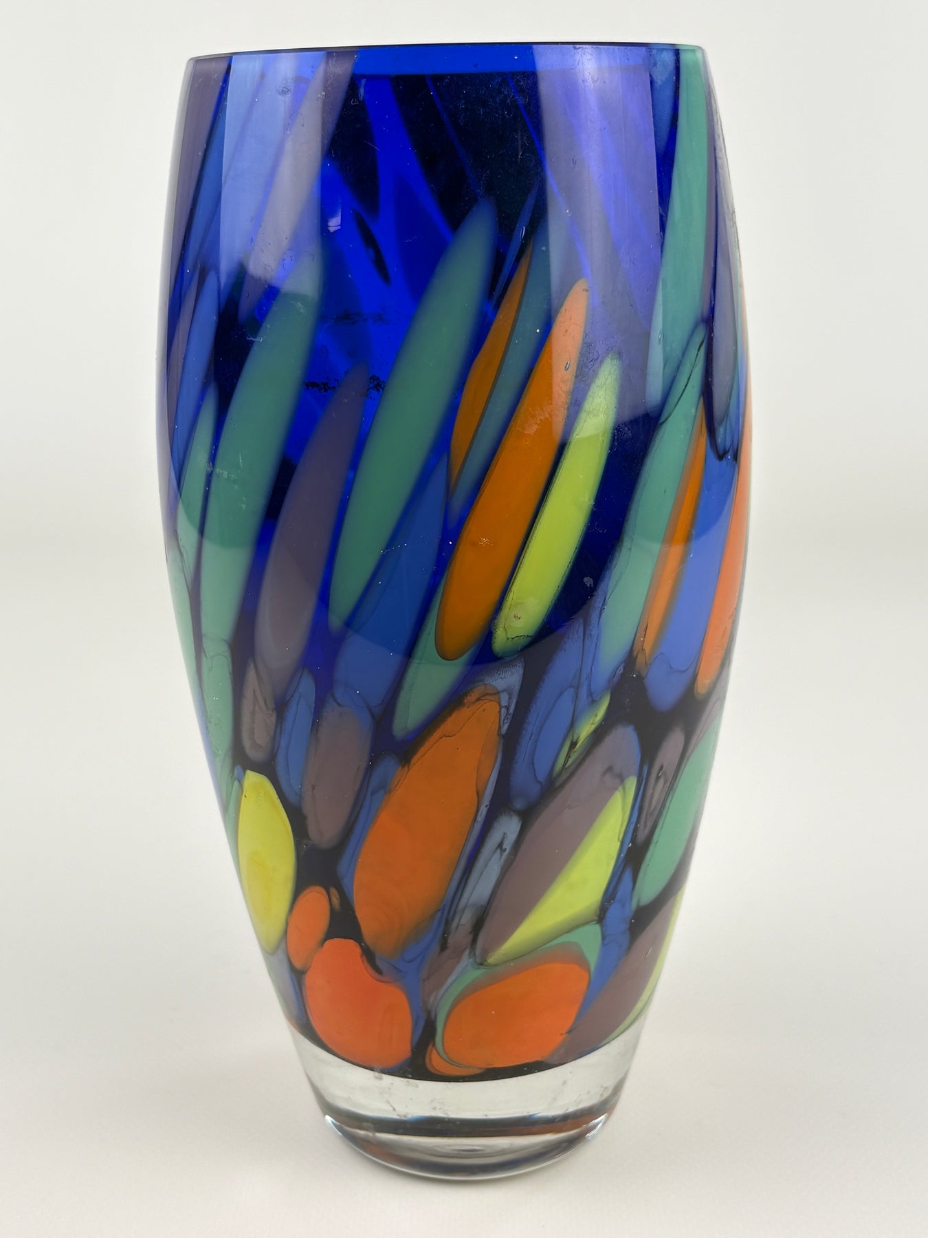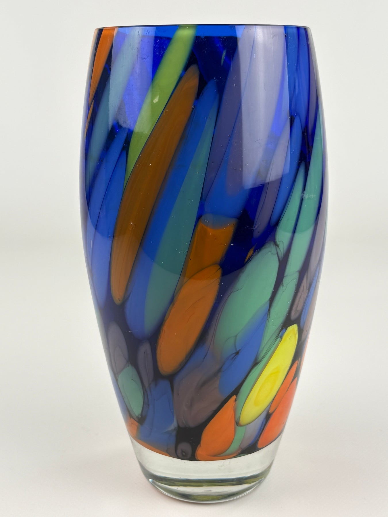 Diese dekorative Vintage Glasvase aus Venedig (Italy) begeistert mit einem lebendigen Farbspiel aus Blau, Grün, Gelb und Orange. Die farbigen Glaselemente verlaufen organisch durch das klare Glas und erzeugen eine dynamische, mosaikartige Struktur, die typisch für venezianisches Kunstglas ist.