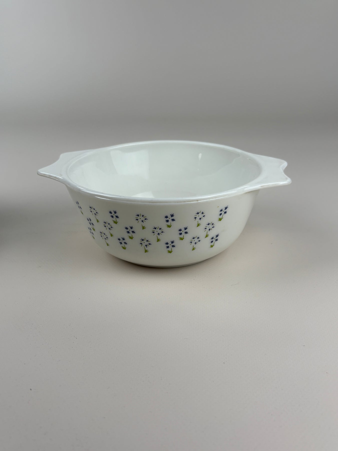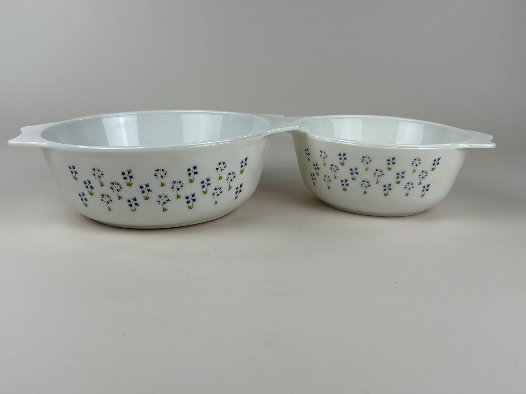 Dieses charmante Vintage PYREX Auflaufformen-Set besteht aus zwei Schalen in unterschiedlichen Größen und überzeugt durch das feine florale Muster auf klassischem weißen Glas. Die typischen seitlichen Griffe sorgen für eine praktische Handhabung und unterstreichen den zeitlosen Küchenstil.