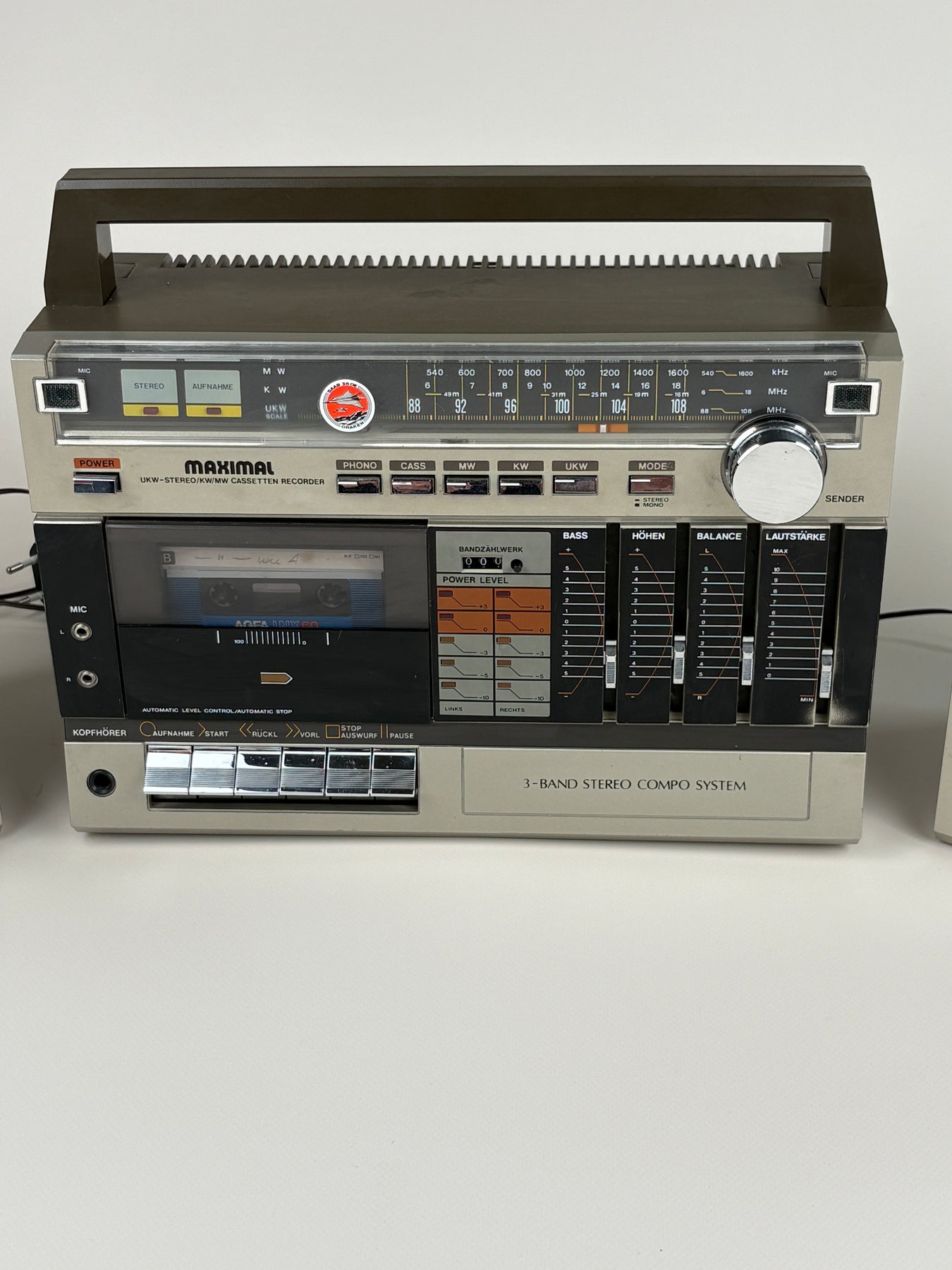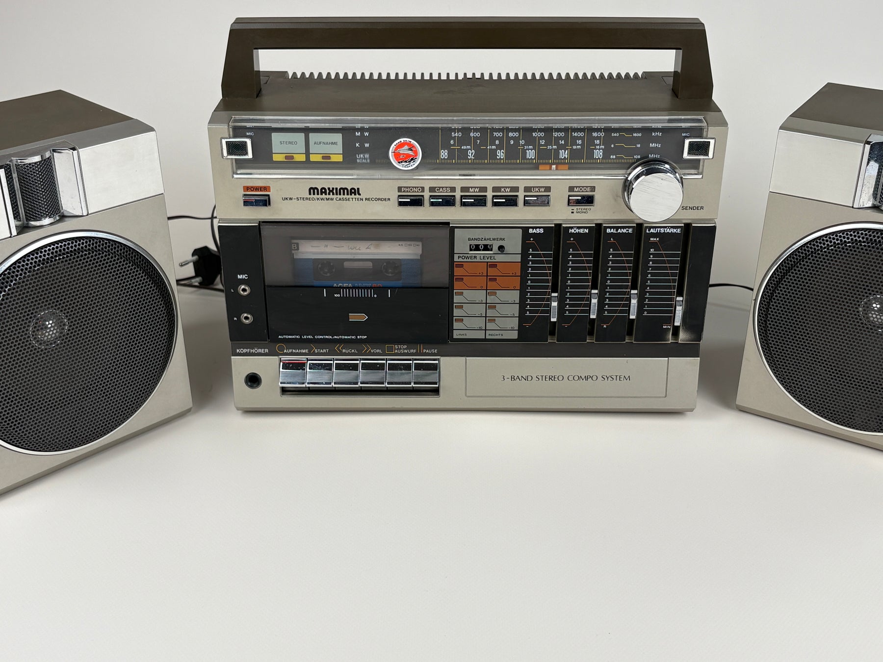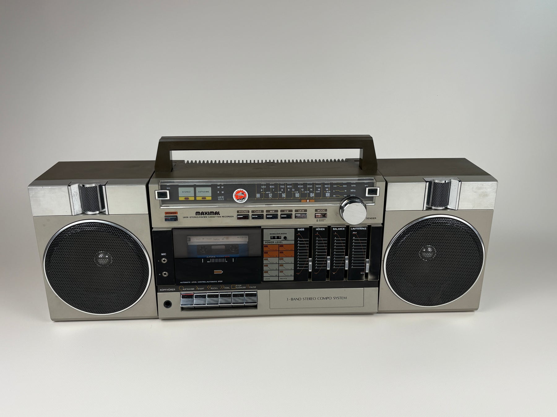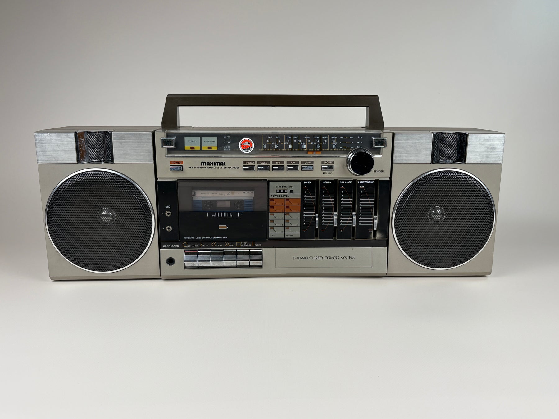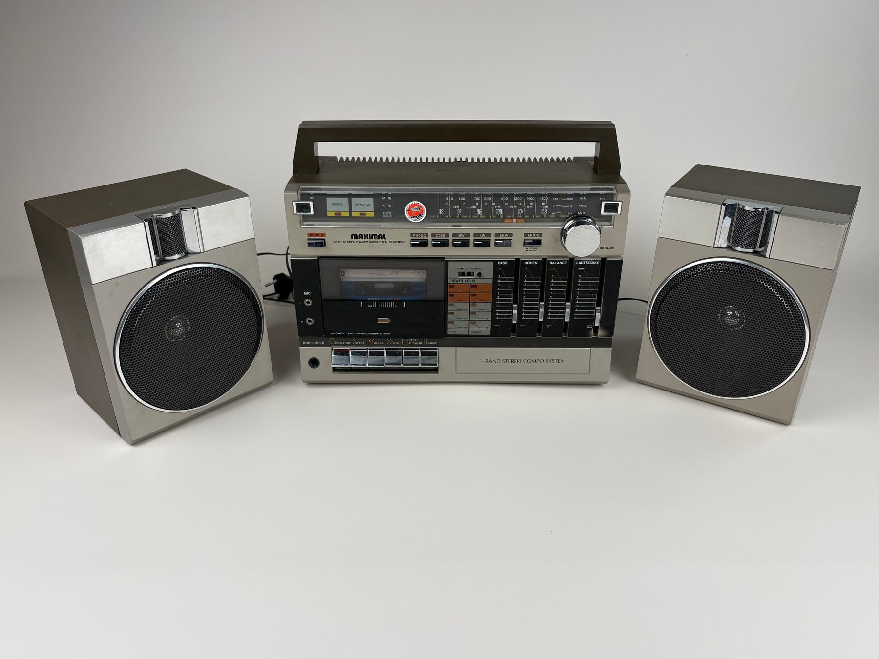 Dieser markante Vintage Stereo-Radio-Kassettenspieler überzeugt durch sein klassisches 1970er/80er Jahre Design mit integrierten Lautsprechern und charakteristischen Bedienelementen. Die Kombination aus Metalloptik, analoger Frequenzskala und Equalizer-Reglern verleiht dem Gerät eine authentische Retro-Ästhetik mit technischem Charme.